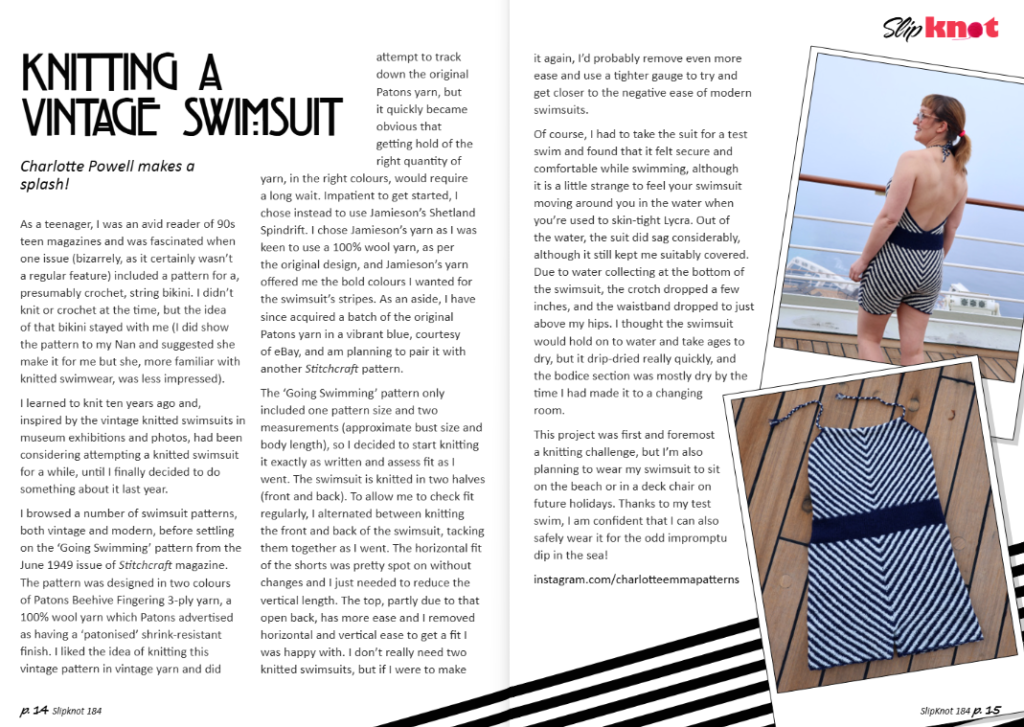 Back in September, I had a short article about my knitted swimsuit included in Slipknot, the Knitting and Crochet Guild’s members magazine. The magazine (like all roles in the Guild) is created by volunteers, so I was glad to be able to make a small contribution, and being the cover image was a nice surprise […]